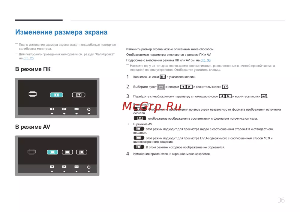 Узнайте, как изменить размер экрана и провести повторную калибровку монитора в режимах ПК и AV. Подробные инструкции и советы по настройке.