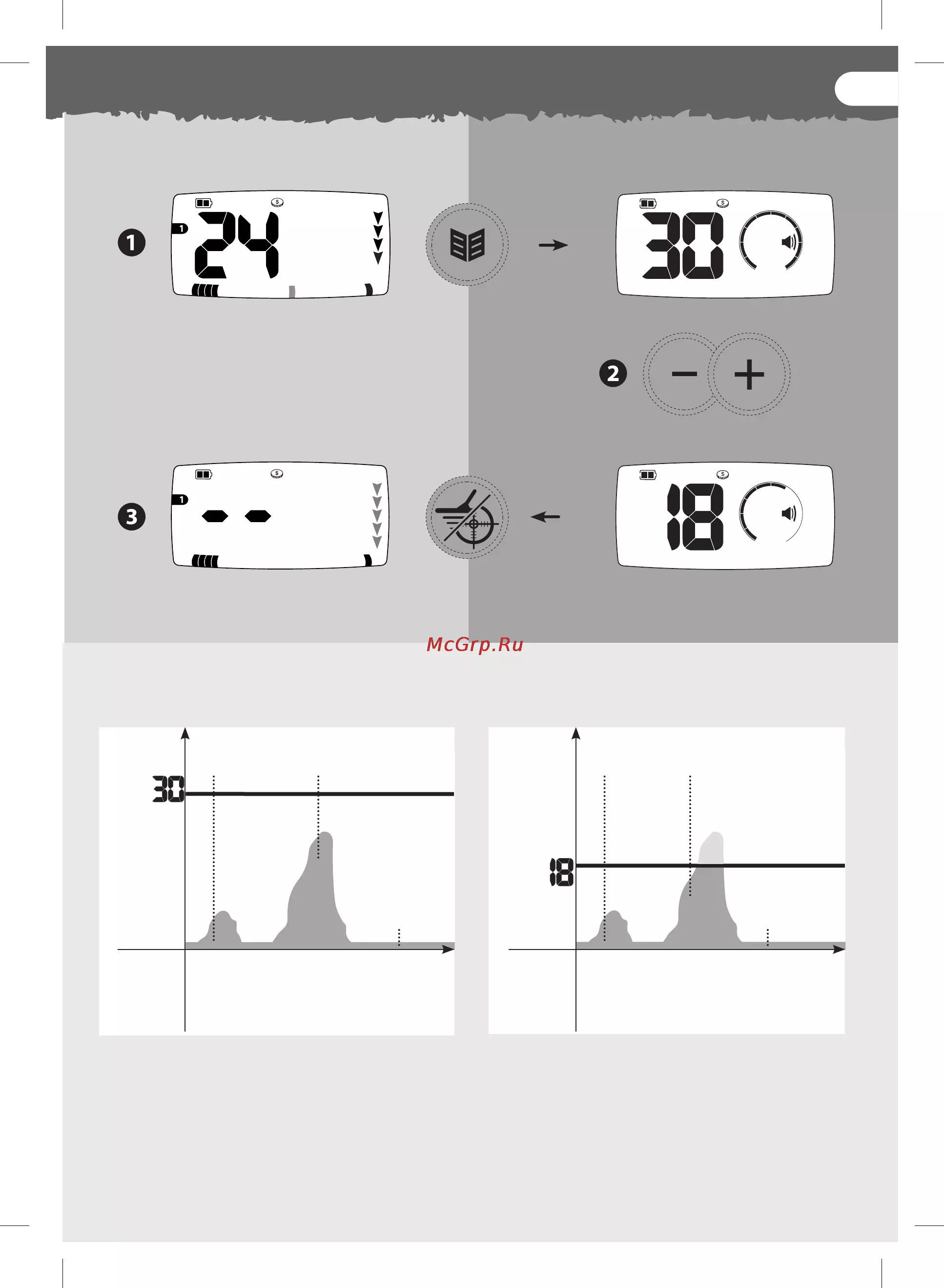 - Вы можете изменять настройки 1 2 3 и 4 и создавать ваши собственные настройки дискриминации измененные настройки сохраняются автоматически при переключении настроек дискриминации или после выключения детектора p.22