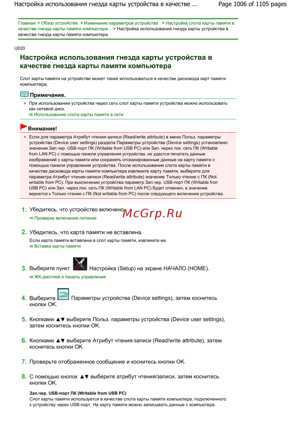 ![Canon Pixma MG6240 [1006/1105] Настройка использования гнезда карты устройства в](/views2/1061431/page1006/bg3ee.png)