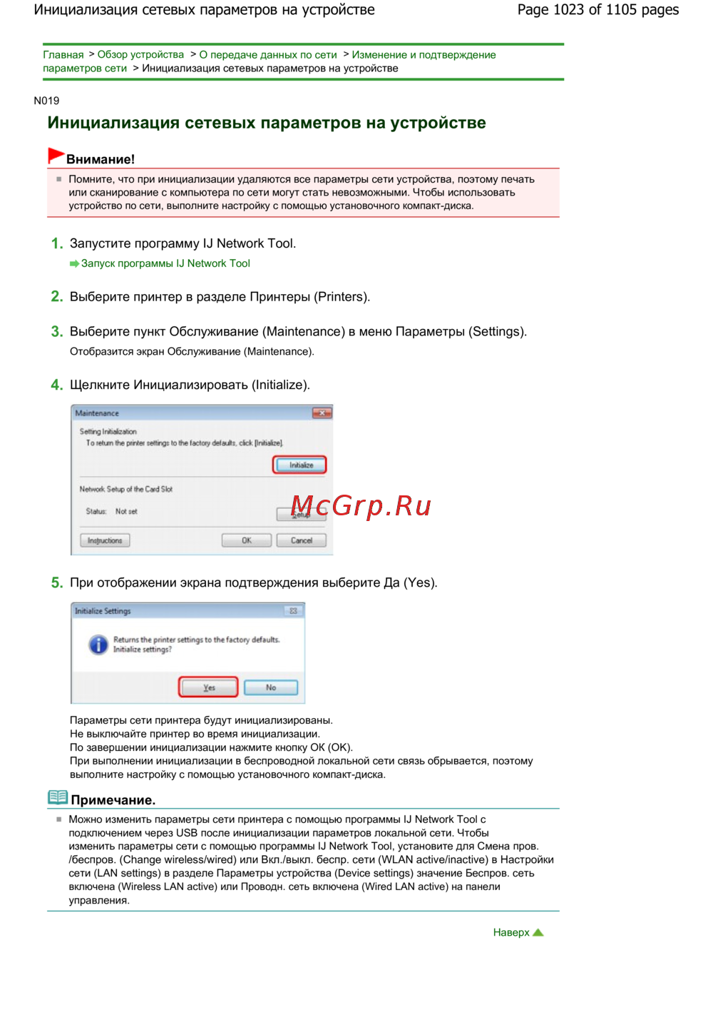 Помните, что при инициализации удаляются все параметры сети устройства, поэтому печать