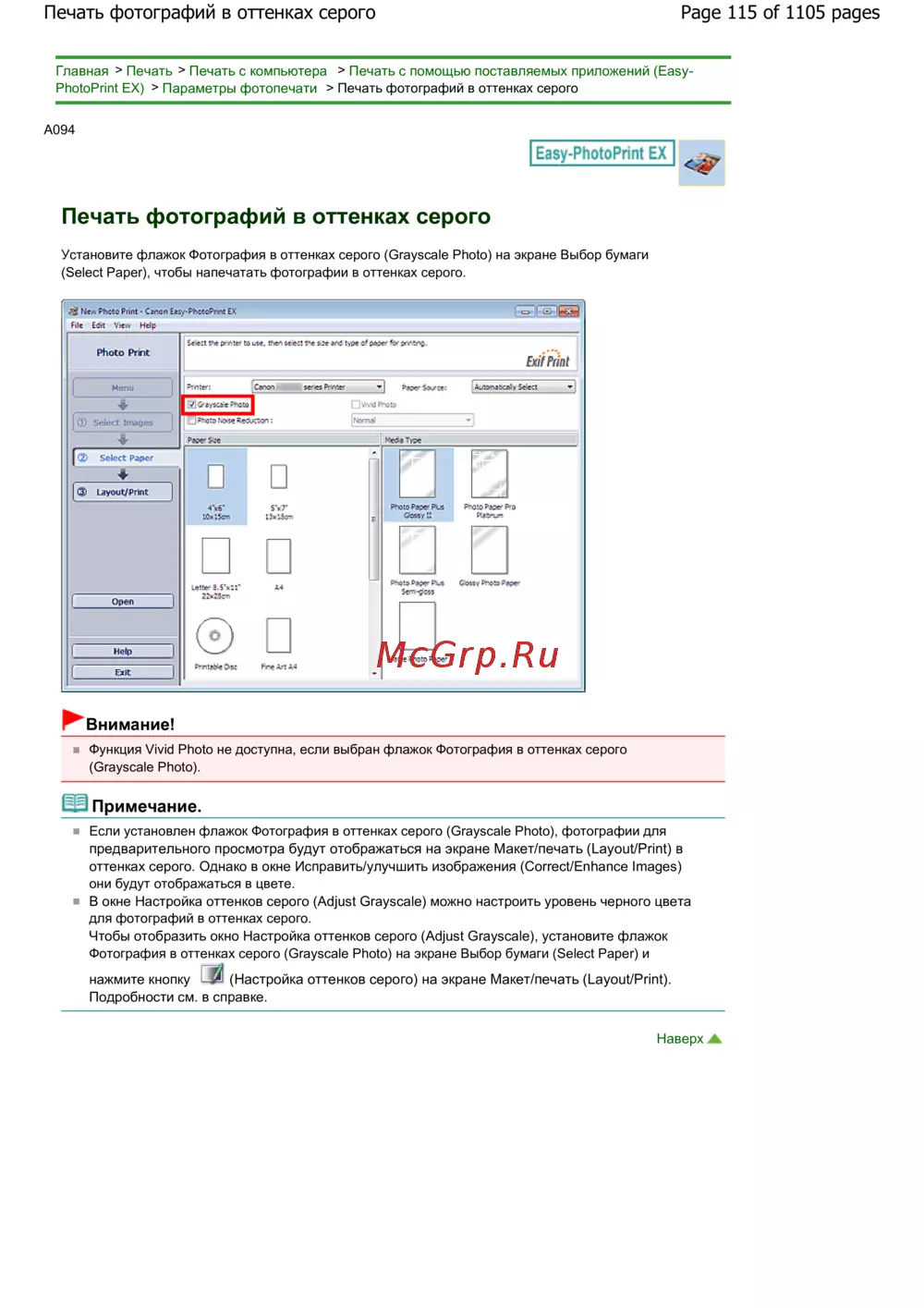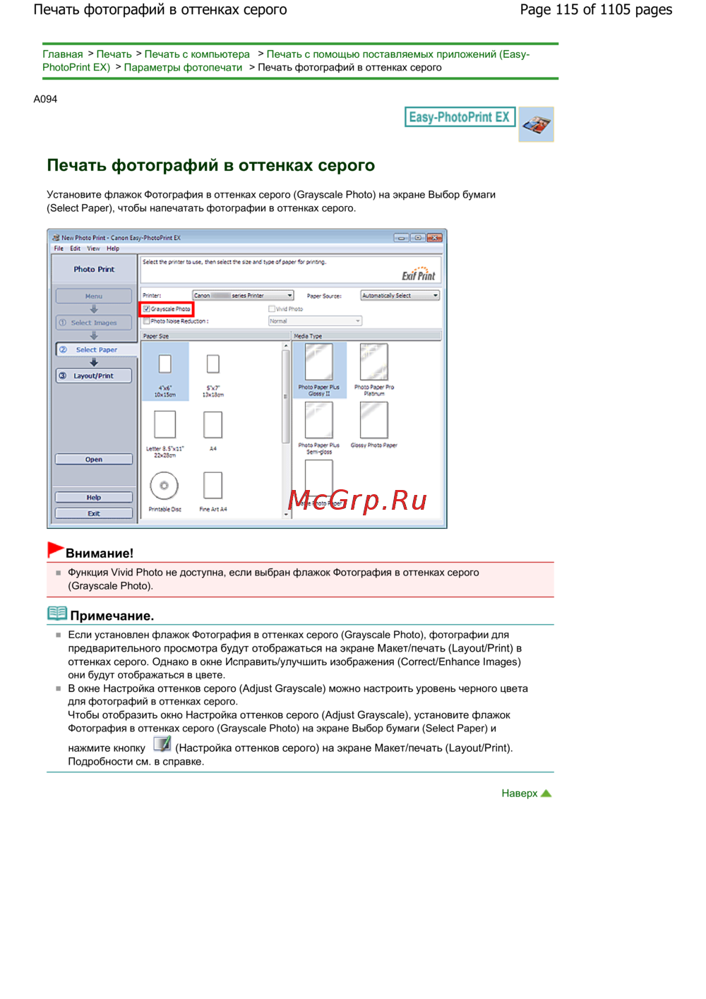 (Select Paper), чтобы напечатать фотографии в оттенках серого.