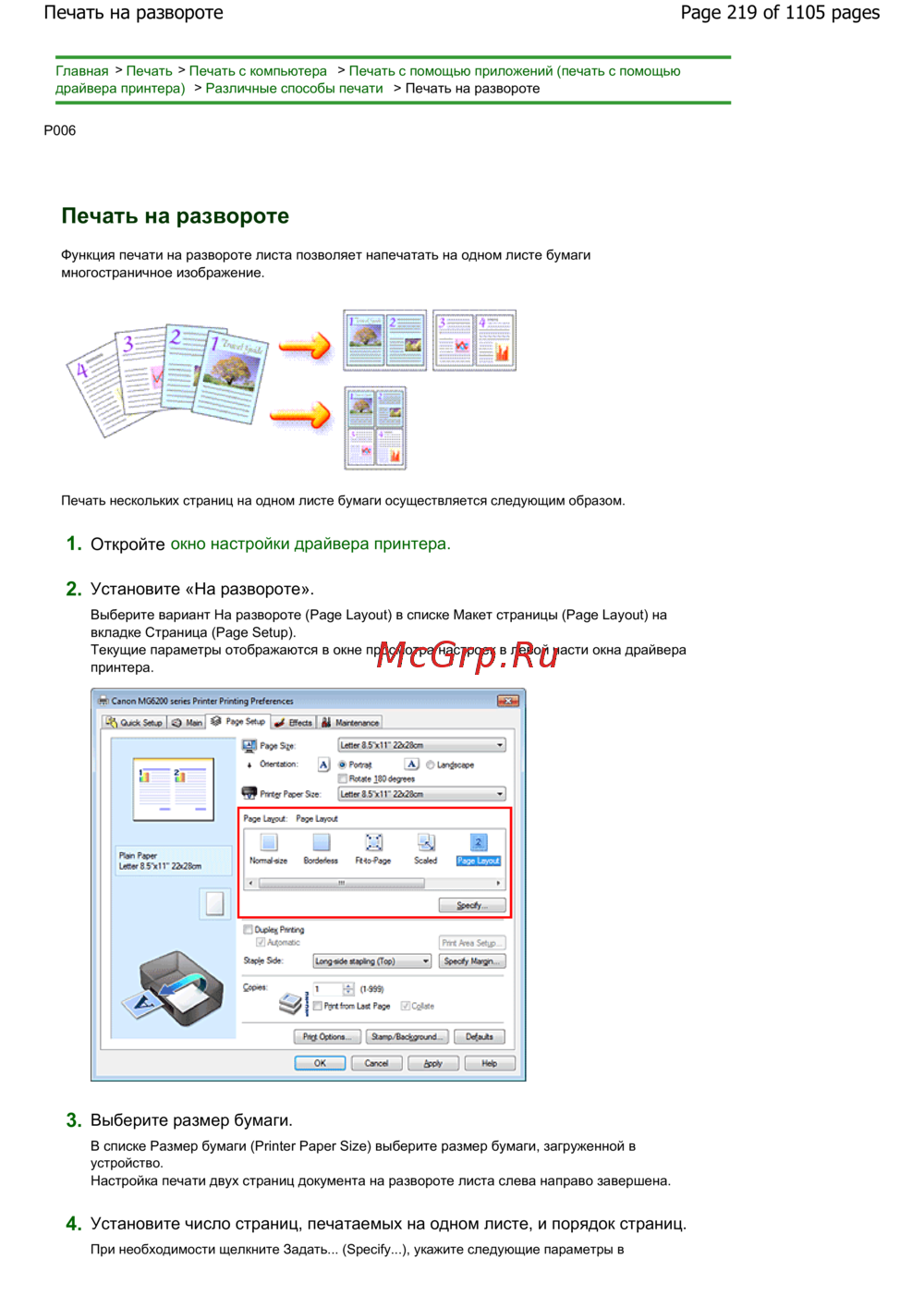 Canon Pixma MG6240 — как настроить печать на развороте для многостраничных документов [219/1105]
