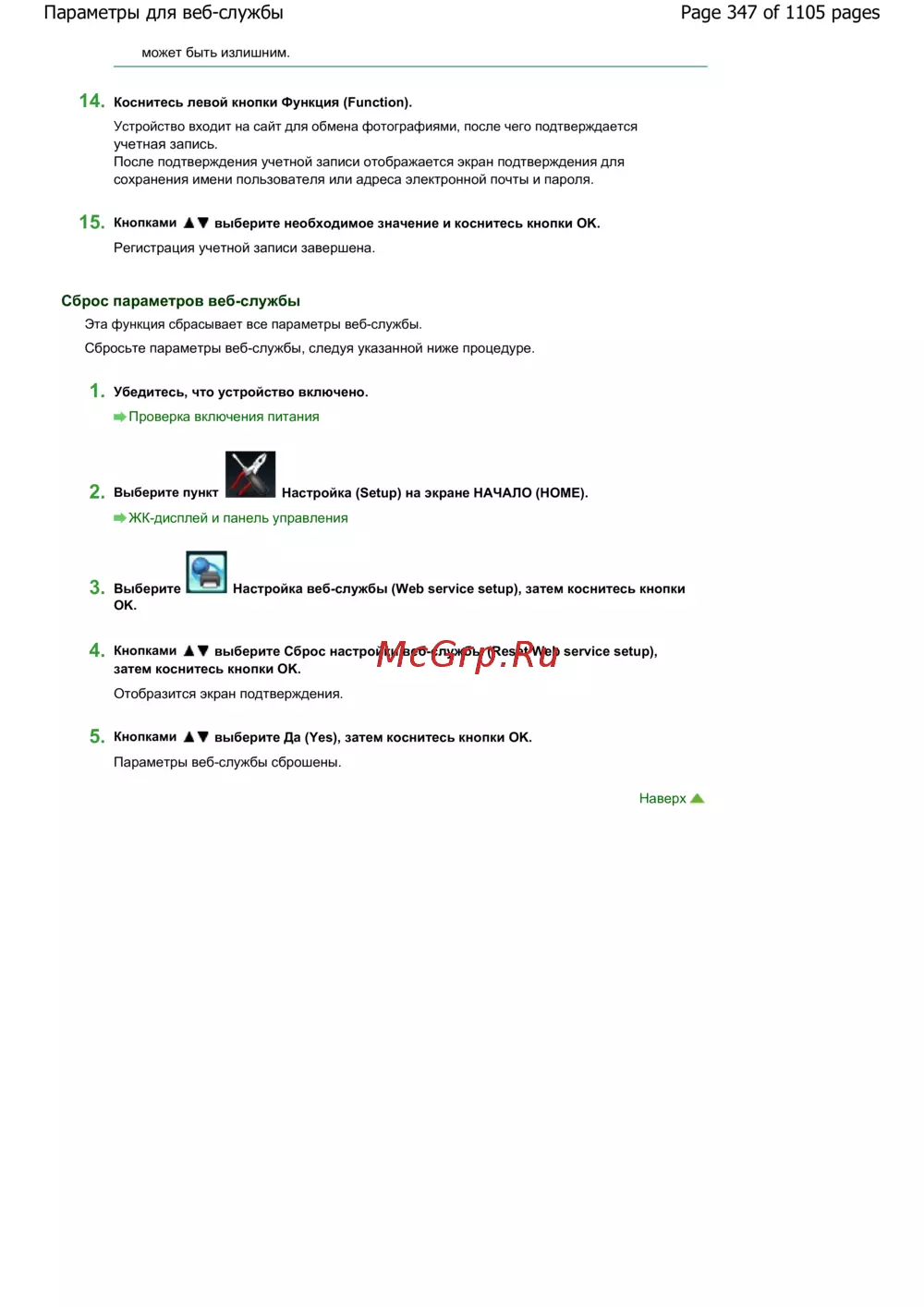 ![Canon Pixma MG6240 [347/1105] Сброс параметров веб службы](/views2/1061431/page347/bg15b.png)
