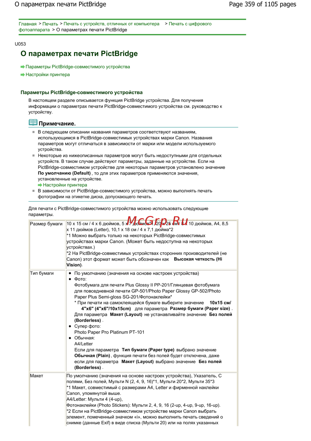 Canon Pixma MG6240 — печать с цифровых устройств: параметры PictBridge и настройки [359/1105]