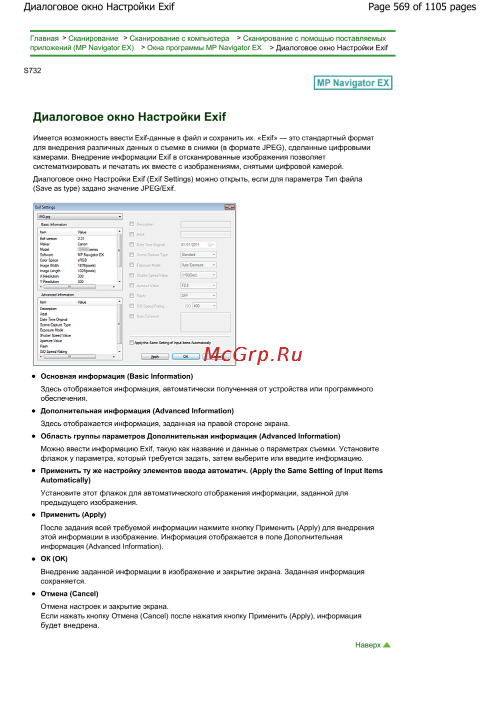 Page 569 of 1105 pagesДиалоговое окно Настройки Exif