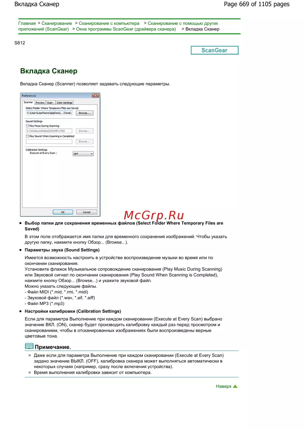 Узнайте, как настроить параметры сканирования, включая выбор папки для временных файлов и настройки звука. Оптимизируйте процесс сканирования с помощью калибровки.