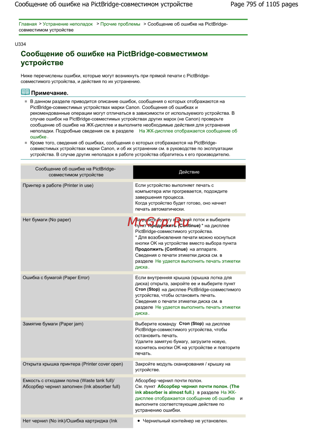 Узнайте, как устранить распространенные ошибки на PictBridge-совместимых устройствах. Подробные инструкции по решению проблем с печатью и настройками.