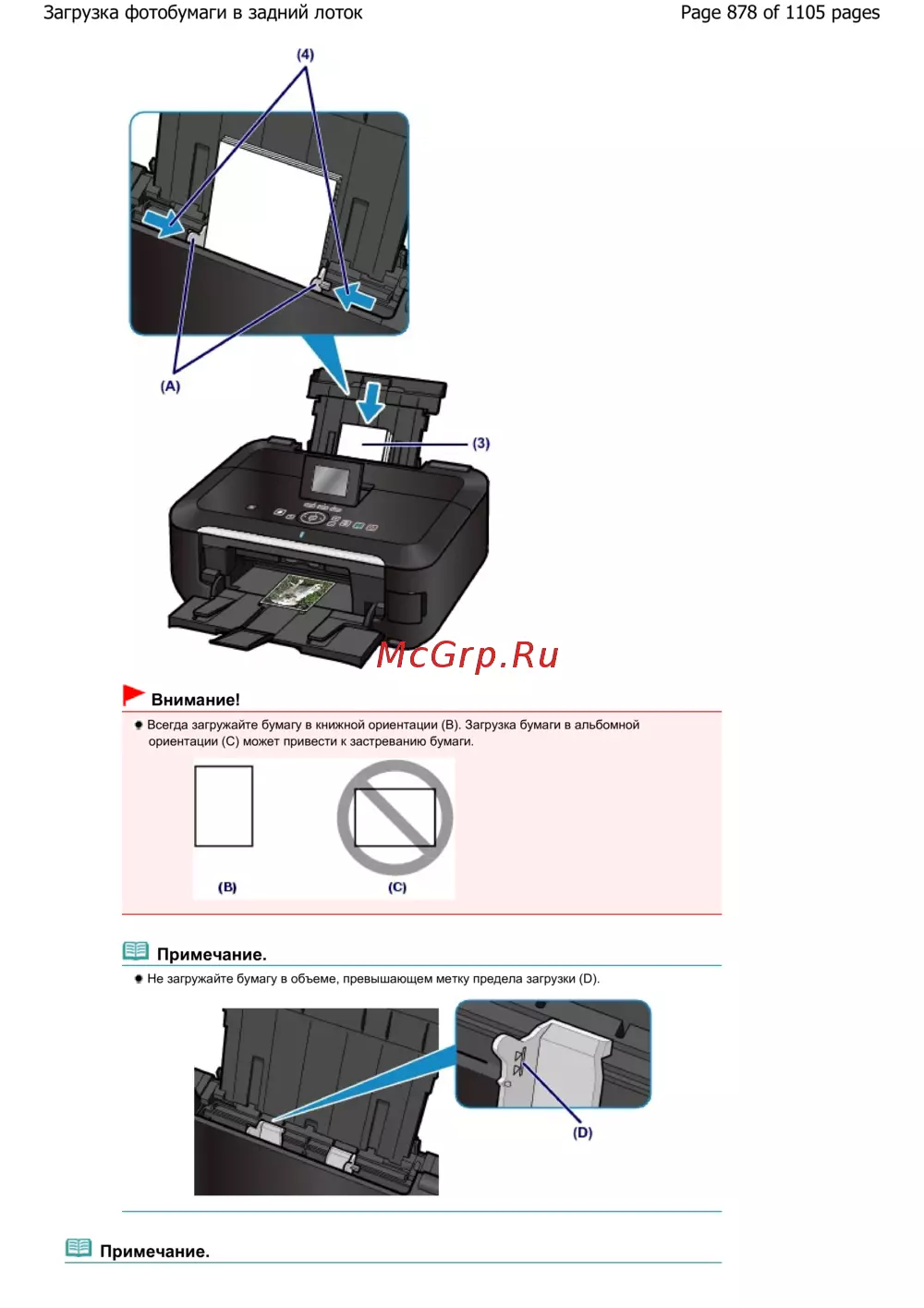 Page 878 of 1105 pagesЗагрузка фотобумаги в задний лоток