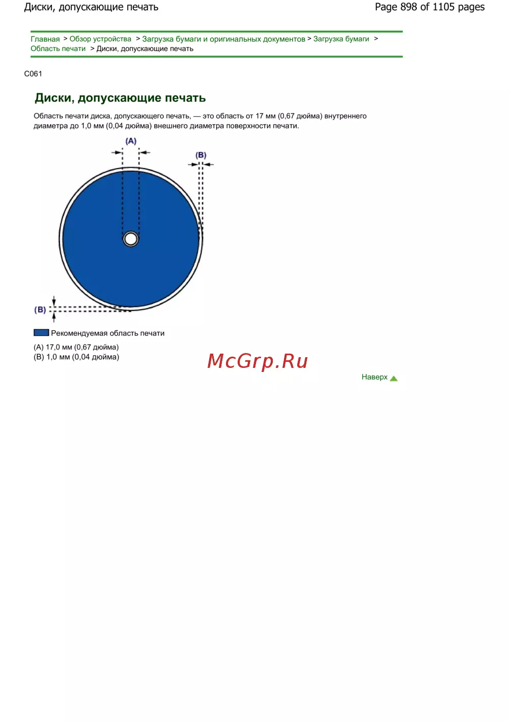 Область печати диска, допускающего печать, — это область от 17 мм (0,67 дюйма) внутреннего