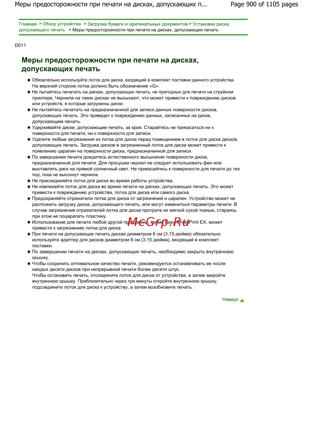 Page 900 of 1105 pagesМеры предосторожности при печати на дисках, допускающих п...