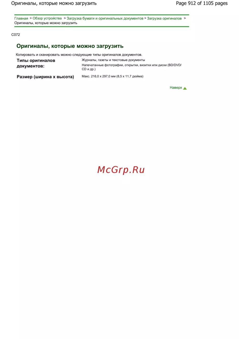 Узнайте, какие типы оригиналов документов можно загружать для копирования и сканирования. Подробности о размерах и форматах оригиналов.