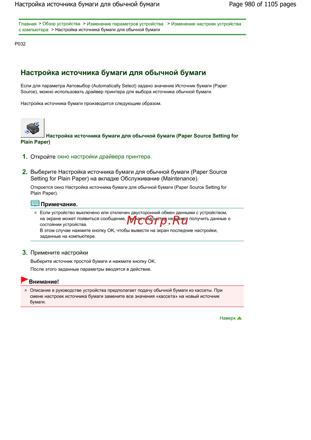 Page 980 of 1105 pagesНастройка источника бумаги для обычной бумаги