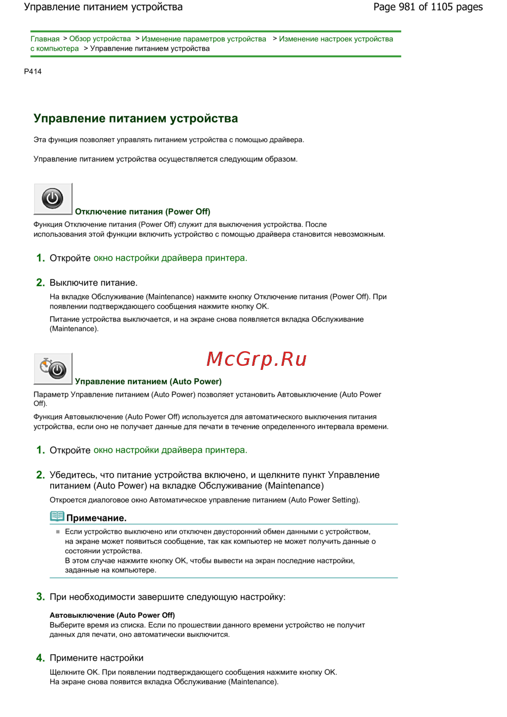 Canon Pixma MG6240 — управление питанием устройства: настройки и функции [981/1105]