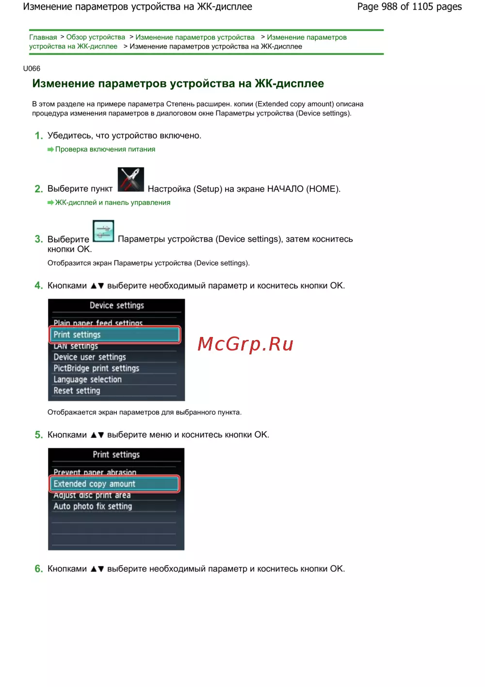 Canon Pixma MG6240 — изменение параметров устройства на ЖК-дисплее: пошаговое руководство [988/1105]