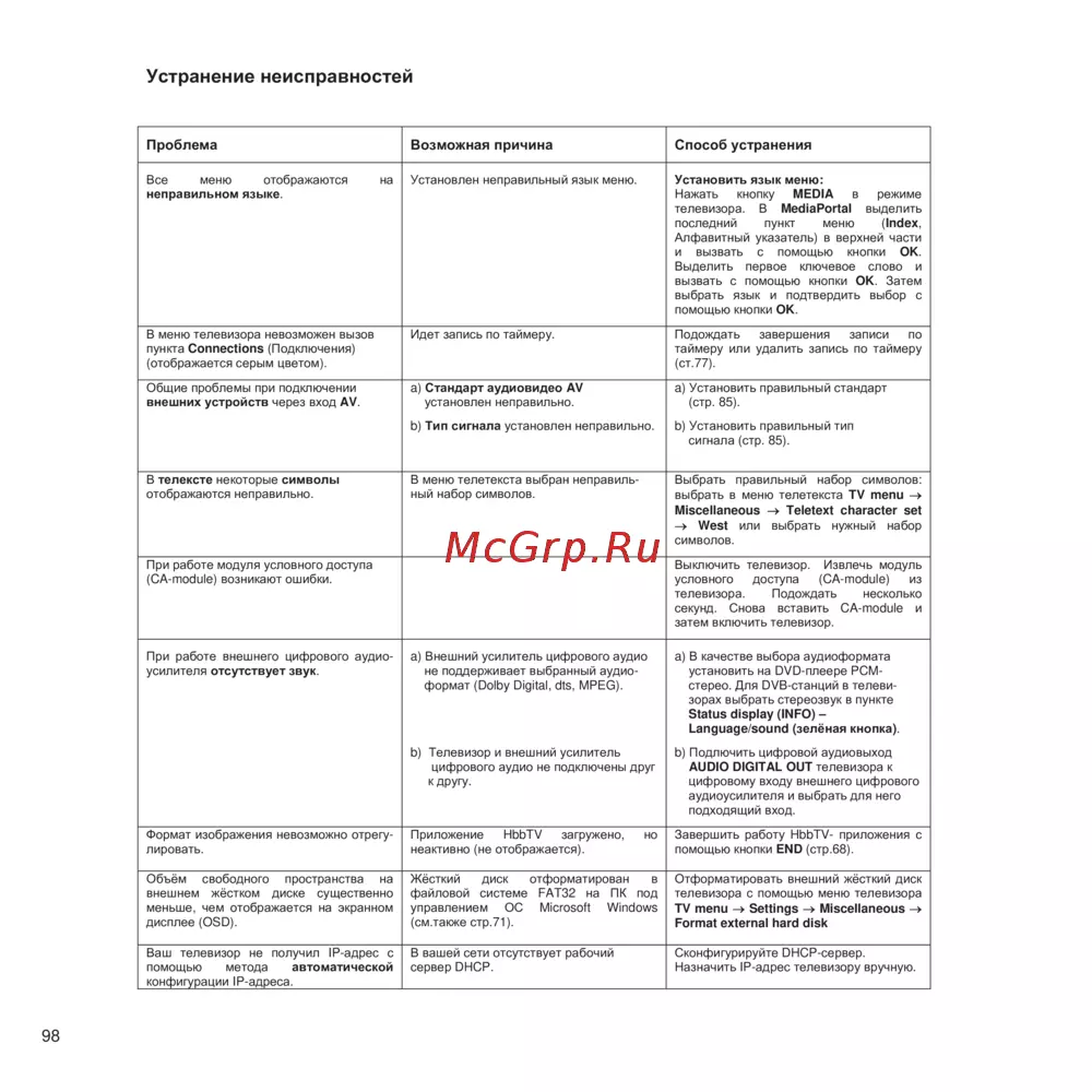 Loewe Connect 50401T80 Silver [98/120] Устранение неисправностей