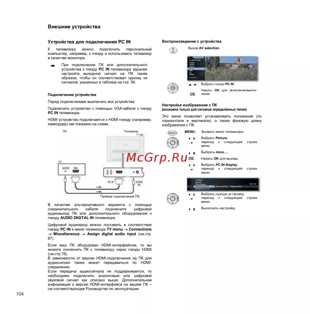 устройства к гнезду PC IN телевизора заранее