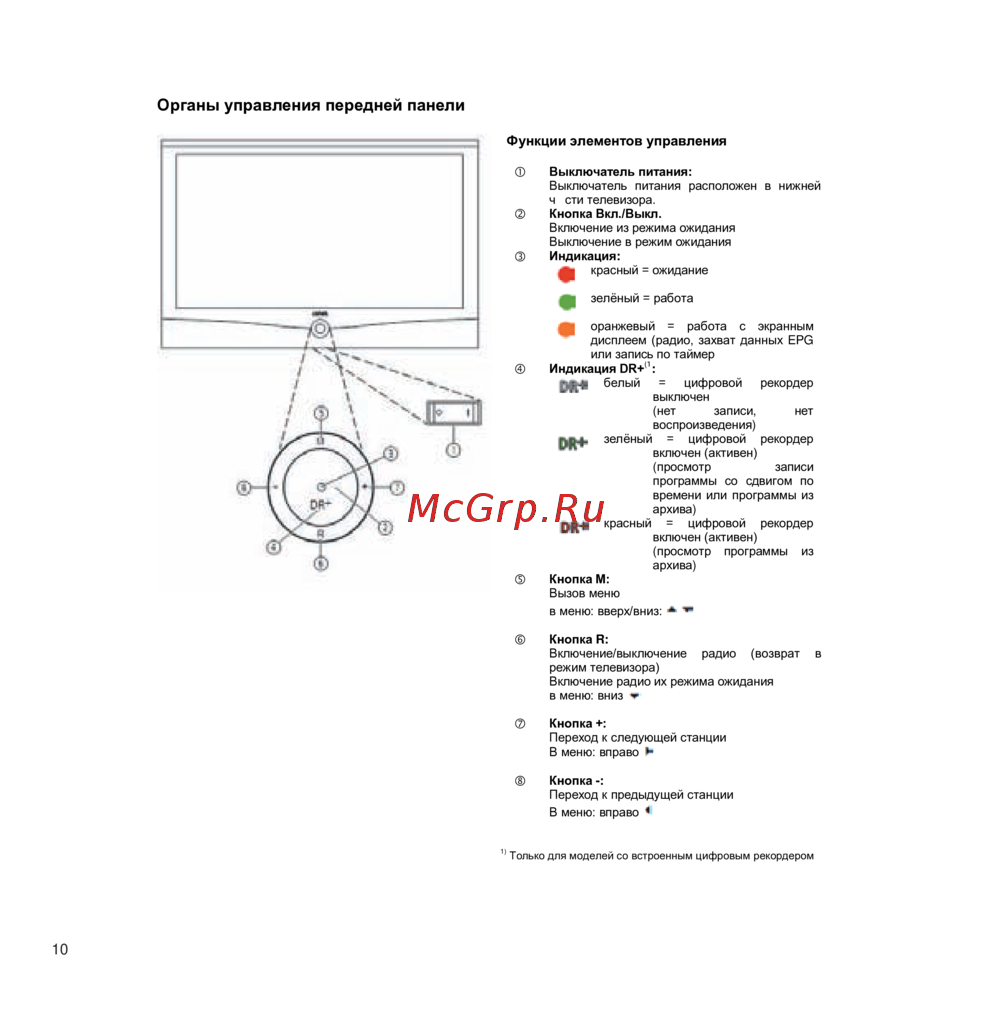 Узнайте о функциях органов управления передней панели телевизора. Подробное описание кнопок, индикаторов и их значений для удобства использования.