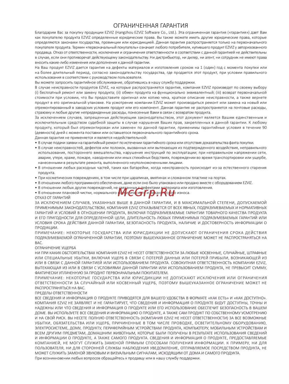 На Ваш продукт EZVIZ дается гарантия на дефекты материалов и изготовления сроком на 1 (один) год с момента покупки или