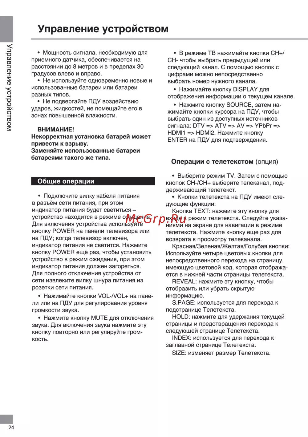 Управление устройством Управление устройством Мощность сигнала необходимую для приемного датчика обеспечивается на расстоянии до 8 метров и в пределах 30 градусов влево и вправо Не используйте одновременно новые и использованные батареи или батареи разных типов Не подвергайте ПДУ воздействию ударов жидкостей не помещайте его в зонах повышенной влажности ВНИМАНИЕ Некорректная установка батарей может привести к взрыву Заменяйте использованные батареи батареями такого же типа Общие операции Подключите вилку кабеля питания в разъём сети питания при этом индикатор питания будет светиться устройство находится в режиме ожидания Для включения устройства используйте кнопку POWER на панели телевизора или на ПДУ когда телевизор включен индикатор питания не светится Нажмите кнопку POWER ещё раз чтобы установить устройство в режим ожидания при этом индикатор питания должен загореться Для полного отключения устройства от сети извлеките вилку шнура питания из розетки сети питания Нажимайте кнопки VOL VOL на пане ли или на ПДУ для регулирования уровня громкости звука Нажмите кнопку MUTE для отключения звука Для включения звука нажмите эту кнопку повторно или регулируйте гром кость 24 В режиме ТВ нажимайте кнопки СН СН чтобы выбрать предыдущий или следующий канал С помощью кнопок с цифрами можно непосредственно выбрать номер нужного канала Нажимайте кнопку DISPLAY для отображения информации о текущем канале Нажмите кнопку SOURCE затем на жимайте кнопки курсора на ПДУ чтобы выбрать один из доступных источников сигнала DTV ATV AV YPbPr HDMI1 HDMI2 Нажмите кнопку ENTER на ПДУ для подтверждения Операции с телетекстом опция Выберите режим TV Затем с помощью кнопок СН СН выберите телеканал под держивающий телетекст Кнопки телетекста на ПДУ имеют сле дующие функции Кнопка TEXT нажмите эту кнопку для входа в режим телетекста Следуйте указа ниями на экране для навигации в режиме телетекста Нажмите кнопку еще раз для возврата к просмотру телеканала Красная Зеленая Желтая Голубая кнопки Используйте четыре цветовых кнопки для непосредственного перехода на страницу имеющую цветовой код которая отобража ется в нижней части страницы телетекста REVEAL нажмите эту кнопку чтобы отобразить или убрать скрытую информацию S PAGE используется для перехода к подстранице Телетекста HOLD нажмите для удержания текущей страницы и предотвращения перехода к следующей странице Телетекста INDEX используется для перехода к заглавной странице Телетекста SIZE изменяет размер Телетекста