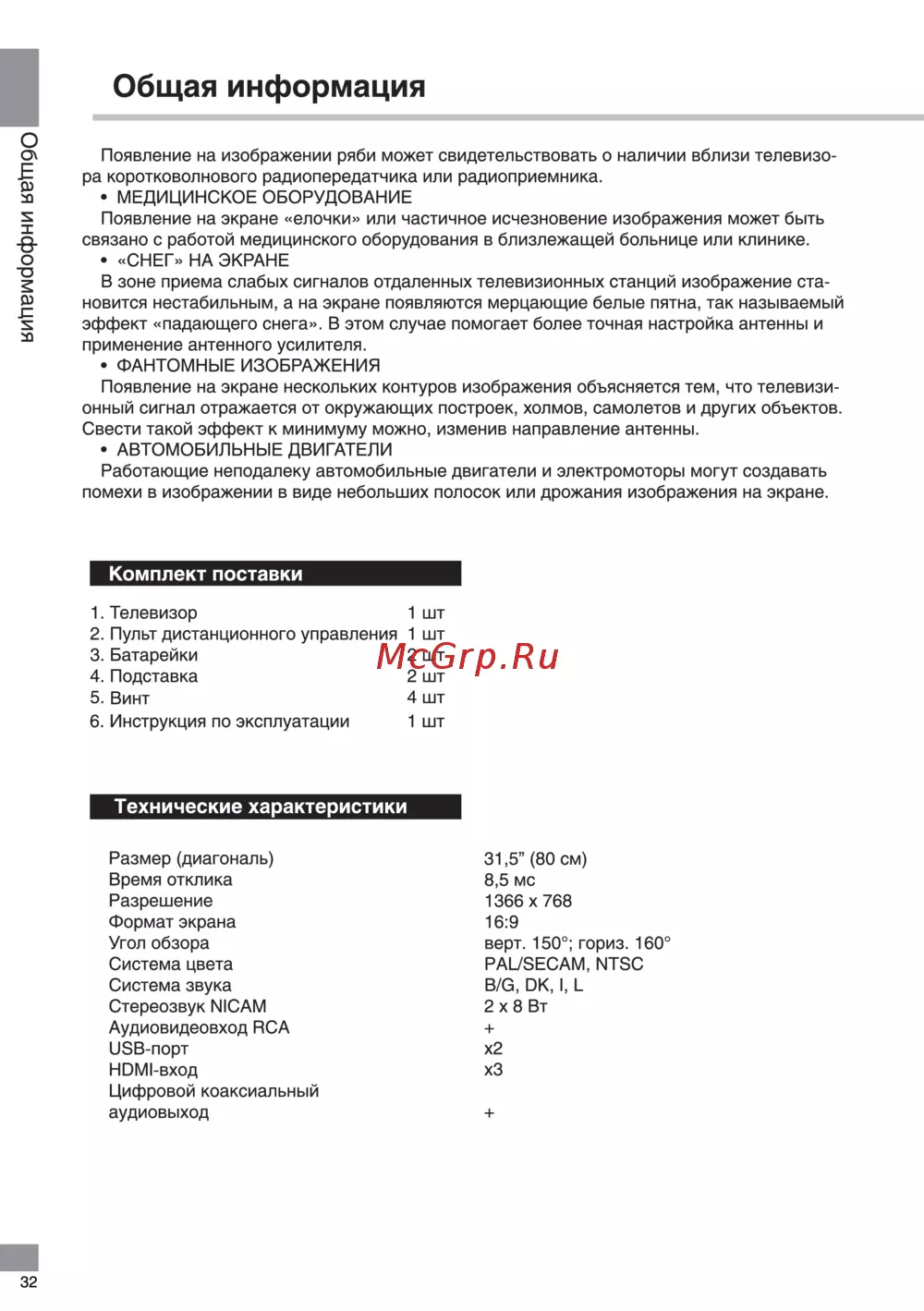 Общая информация Общая информация Появление на изображении ряби может свидетельствовать о наличии вблизи телевизо ра коротковолнового радиопередатчика или радиоприемника МЕДИЦИНСКОЕ ОБОРУДОВАНИЕ Появление на экране елочки или частичное исчезновение изображения может быть связано с работой медицинского оборудования в близлежащей больнице или клинике СНЕГ НА ЭКРАНЕ В зоне приема слабых сигналов отдаленных телевизионных станций изображение ста новится нестабильным а на экране появляются мерцающие белые пятна так называемый эффект падающего снега В этом случае помогает более точная настройка антенны и применение антенного усилителя ФАНТОМНЫЕ ИЗОБРАЖЕНИЯ Появление на экране нескольких контуров изображения объясняется тем что телевизи онный сигнал отражается от окружающих построек холмов самолетов и других объектов Свести такой эффект к минимуму можно изменив направление антенны АВТОМОБИЛЬНЫЕ ДВИГАТЕЛИ Работающие неподалеку автомобильные двигатели и электромоторы могут создавать помехи в изображении в виде небольших полосок или дрожания изображения на экране Комплект поставки 1 Телевизор 1 шт 2 Пульт дистанционного управления 1 шт 3 Батарейки 2 шт 4 Подставка 2 шт 4 шт 5 Винт 6 Инструкция по эксплуатации 1 шт Технические характеристики Размер диагональ Время отклика Разрешение Формат экрана Угол обзора Система цвета Система звука Стереозвук NICAM Аудиовидеовход RCA USB порт HDMI вход Цифровой коаксиальный аудиовыход 32 31 5 80 см 8 5 мс 1366x768 16 9 верт 150 гориз 160 PAL SECAM NTSC В G DK I L 2 x 8 Вт x2 хЗ