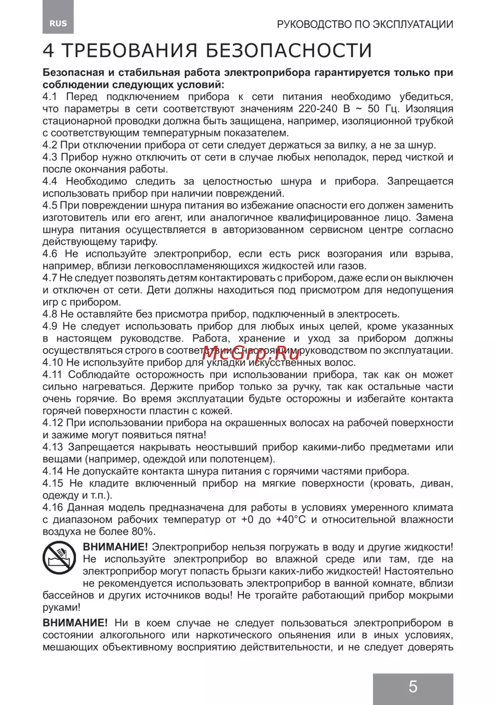 4.2 При отключении прибора от сети следует держаться за вилку, а не за шнур.