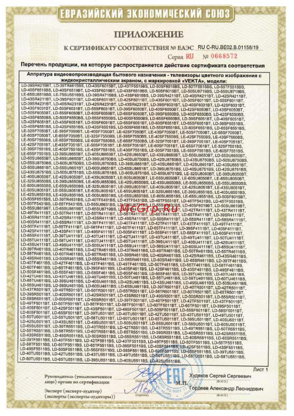 РАЗИЙСКИЙ ЭКОНОМИЧЕСКИЙ союз ПРИЛОЖЕНИЕ К СЕРТИФИКАТУ СООТВЕТСТВИЯ ЕАЭС Ии C RU BE02 B 0115 19 Серия КО 0668572 Перечень продукции на которую распространяется действие сертификата соответствия Аппратура видеовопроизводящая бытового назначения телевизоры цветного изображения с жидкокристаллическим экраном с маркировкой УЕКТА модели Т вТ1М9ГЧ4б15В8ЛО43 Г О403Ев519ВЗ О408Я65198Т О433Е6019ВТ ЦМ38РЮ19В5 1Х 503Е6019ВТ 10 5080871968 10 5530871968 1Е 65805518В8 18 7580551808 0 3984471503 О435Г6515ВЗ 0 39884211ВТ О403Я4211ВТ 04238421181 10 43344211 ВТ 10 39386011 ВТ 04С8Я6О11ВТ О428Е6011ВТ 0438Р80118Т Ю 508Е6011ВТ О 558Т6011ВТ 0 3984423187 04084423187 04234423187 0 43844231 ВТ О 398Я6031В7 Ю 408ТИ31ВТ 0423Е6031В7 Ю 433Т60318Т 0 503Ев031В7 О 555Р О31В7 0 398Е605С67 04ОЗЯ ЗМВ7 0428Е80508Т 0438Р605С87 Ю 508Р6050вТ Ю 558Е6050В7 0408ЕМ50В7 0458Е605С67 1Х 393Е65ИВ 0403Е655СВЗ 1Х425Е655С63 5088 О 5Э8Е65бСВЗ 0 5йЗЕ6550В8 0408Е6560В 0458Е655088 О М8Е6Э51ВТ 1Х403Я Э51В7 0428Я6М В7 О438Я6О51В7 Ю 5ОЗЯЕО51В7 0 553К6051В7 0 603Яе351В7 0453Я6051В7 Ю 393Я5551В8 Ю403Я6551ВЗ 0428Я6551В5 0438Я6551В О М ЗЯ6551В5 О 558Я655168 О Э8Я6551ВЗ О45 Я6551ВЗ Е 328Я7С5ЭВ7 X 393Я705СВ7 Е403Я705067 Е423Я7Э50В7 Е 438Я7С6Э87 Е 503Я7050ВТ Е 553Я7ОМВ7 Е 603Я7С50В7 1Е ИЗЯ7050В7 Е 328Я755ОВ8 Е 398Я755Св8 1Е 408 75МВЗ Е428Р7550В8 Е 438Я755ОВ8 5581755068 Х 608Я7И068 Х 65 Я755СвЗ 1Е 323Р7051ВТ Е 398Я7М1В1 Е405Я7051В7 Е433Я7051В7 Е408 7О51ВТ Е 558Р7051В7 Е 6О8Я705187 Е 65 Я7С 1В7 Е 328Я7551В8 Е 398Я 551Б8 Е408Я75б1В8 Е42 Я7551В8 Х438Я755 В8 Е 5ОЗЯ7551В Е 558Я7551В5 Е 6О8Я755198 Е 653Я7551В8 0 3980665067 0438066506Т О428О885ОВТ 10 4380866087 0 5050865067 0 5530565387 О 53 8650вТ 1 0 1930875083 04С 0в7МВЗ 0425 1875083 10 4380875008 10 5050875008 0 5580875083 10 6080375088 1О 658О8750В8 10 39808651 ВТ 04С808851В7 042308651В7 10 4330885187 0 60808651 ВТ О 655О8651 ВТ 0 3980875183 10 4080875188 042808751 Вз 1 0 5080875188 10 5580875188 10 6080875188 10 6580675188 1Х 328О905С6Т Е 393О8О5ОВ7 1Е 433ОК50ВТ 1Е 508060598Г 1 558и8Э50ВТ I Е4О8ивО5С6Т Е458О0О5С6Т Н 88 4080856088 Е42308550ВЗ 1Х 438и855083 1Х 50808550ВЗ Е 553О855С68 ЕЕ 33308051вТ СЕ Ю8О8О51ВТ 1Е4280М51ВТ Е438080518Т ЙлмЖт ОбОвШТ Е 6О8О0ОЫВ7 Е453080516Т 32306551 ВБ Е 398О8М1В8 Е403иа 1В 1Е 55Зи 551йЗ 1 веЙ1В5 Е40808551В8 Е4Б8О8551В8 Ю 5О8Р6О15ВГ О 4СТР6431В8 Ю43ТЕ54Э183 1О 45ТР5031В7 1О 45ТЕ5431В8 10 450 553185 Я 543 63Е0 М50бе31В8 1 0 5580873165 Ю 55808831В8 Ю 408Е 019ВТ Ц М8О8619ВТ 151 В6 9В ЦМ9ТЙ4111ВТ Ш40Т 4111ВТ Ю42Т44111ВТ Ю 43Г4411Шт иЭ 551К4 8ГЛ0 58ТК4111ВТ ат Ьп5 07 1О 60ТН4111ВТ 10457Й4111ВТ Ю 393И4111ВТ п и1 4 ЗЧ4 1 ВТ Ю 43844111ВТ 104984411187 Ш 50344111ВТ Ц ИЗЧ4111ВТ Ц МЗВ4111ВТ в Г Е ЗЯЦ 111В7 1О 38ТТ4111В7 Ю407Е4111В7 Ц 427Е4111В7 1 Р437Е4111 ВТ Ю49Т 4111 ВТ 1 4 В Г ГЧШВТ Ю60ТЕ4111ВТ Ю 65ТЯ4111ВТ 1О Э95Р4111вТ 1040 1В иМ38Р4 ВТ ВТЛО бОЗЕ ВТ СО ЬЗЕДШВГХО М Ю еО8Е4111ВТ и 39Ти41 вгиО 0ТО4111 ВТ 1042704111ВТ 1043Т04111ВТ Ю49Т041 1ВТ Ю 50ТО4111ВТ 5 МТ В тЖИ 51 СО 07О4111ВТ 1Х в5Ти4111ВТ 10 398041118Т 1040804111ВТ 1042504111ВТ ВТ 304111 ВТ С0 588и4111 ВТ 10 60804111 ВТ I 0 6580411187 1 10 1 46 вз Ь043Т44611В5 СО 4974461188 10 5074461183 10 5574461168 1ПАВ АЗ ОС Е вПВЗ 10 3934461183 104034461168 1042844611В8 1043844611В8 т1з 4М11 10 5584481188 10 5884481185 10 084481168 10 6534461188 Ю 397Е4611В8 ЙЖв 1 Ж 4 ВЗ Е 5 ГГ4в11В8 Ю 7Е4611В8 1О 87 461168 10403Е4611В8 10428Р461188 Ю438Е4611В8 10498 46ЦВЗ Е 588Е4в11В8 Ю вОЗМб 1ВЭ Ю 653Е461183 10 3970451188 1 0 40704611В5 У4 33 СД49 О461188 0 5070461185 ЬО 557Ц4В1 88 10 5870481183 СО 607О4811В8 25и46 33 104380461185 04980461188 10 5680461188 Ю 5 ЗО4611В8 10 6030461168 10 6550461185 0 3974501187 1X4074501187 1X4278 1011117 1О 9 1187 В 10 50745011ВТ 0 55 8501167 10 56145011ВТ 1 0 6014501 ВТ 1 7450 ВТ Ю 398450 Г8Г 0 4084501161 04284501161 1X438850118Г 1X4984501187 I О Я IМ I о ки 491Ь5и11В1Л0 ЭД ЕЗИ1ВТ 10 55ТЕ50118Т и 58ТР5011ВТ Ш бОТЕЯИ 1В I МЭТЕ ИЯТ I иМЗЗге ВТ 1Х498Р5011В7 0 М8Е5011В7 0 553Е5011вТ О 88Е5О1 7 ВТ ш 39Т1в0 В7 04070501187 Х42ТОй011В7 1О43ТО5011ВГ 04970501187 ЙЯ М I о Я т Ж В1 Ю в57О5011ВТ 0 3980501187 О 408Ш011В7 0458050 ШТ о1ЖЖ I п м и501 вт 830501167 0 6030501187 В1 1 МгТЮ5 83 04374551188 0 4978551188 0 50745511ВЭ 0433 51 5 йй т РО о 6 1ВЗ Е 98 5511В8 О40845 1183 042345511В8 О ЕЭД 8 1 0 6588551183 О 5Я845511В8 0 6084551188 048845511ВЗ ЕХЖ Ж ЙГ 1Р 6ОТМД511ВЗ Р 65Ти5511ВЗ 0 39305511В8 10 4030551165 1188x0451X55116 0 53 0551183 1 88 Лист 1 1 укоы1дитель уполномоченной лицо органа по сертификации Эксперт эксперт аулюор эксперты эксперты аудиторы Худяков Сергей Сергеевич Гордеев Александр Леонидович