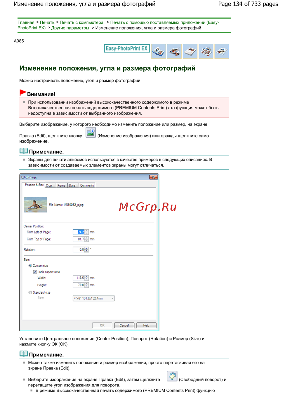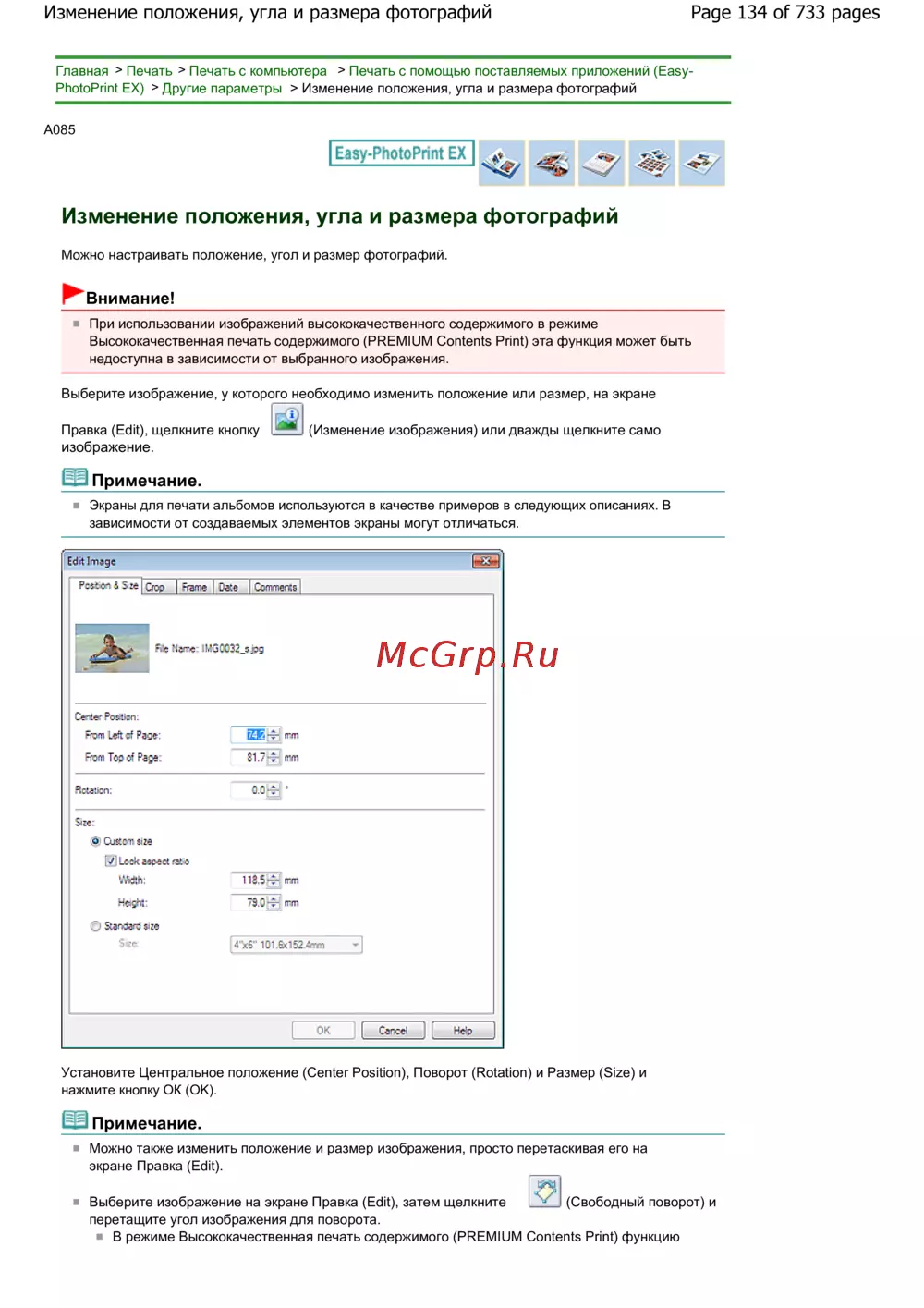 Page 134 of 733 pagesИзменение положения, угла и размера фотографий