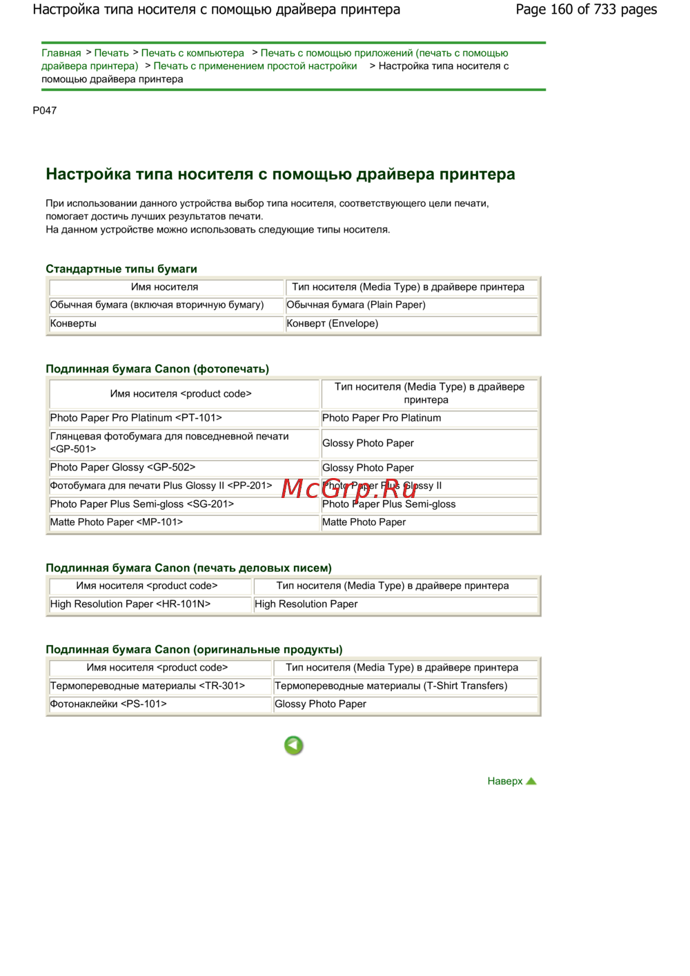 Page 160 of 733 pagesНастройка типа носителя с помощью драйвера принтера