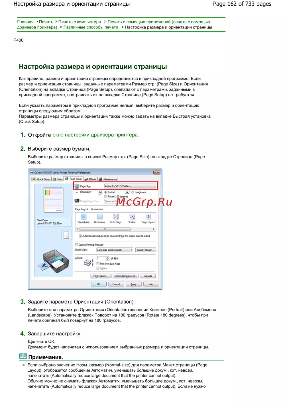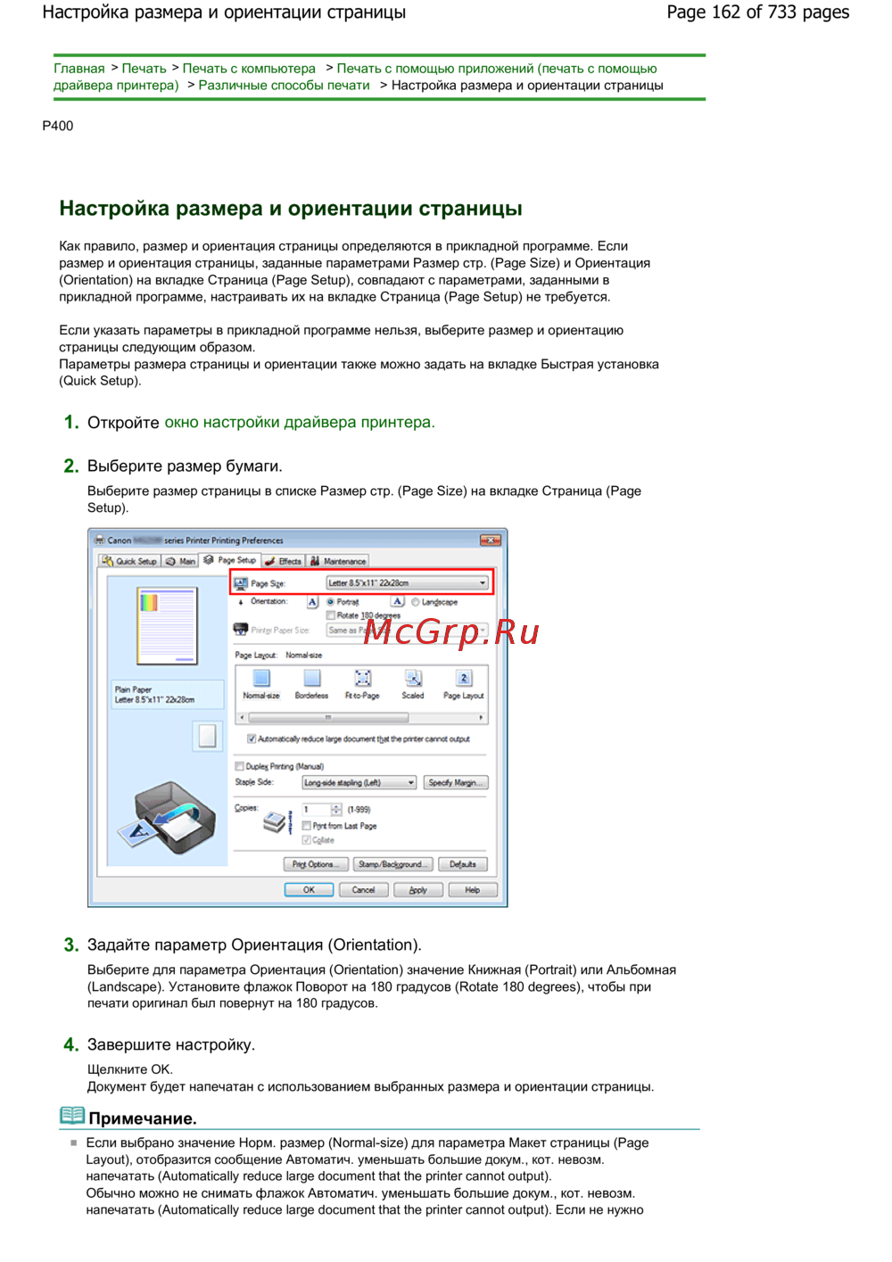 Canon Pixma MG2140 — настройка размера и ориентации страницы для печати [162/733]