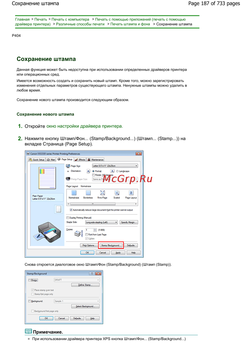 При использовании драйвера принтера XPS кнопка Штамп/Фон... (Stamp/Background...)