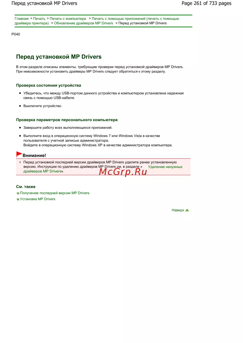 При невозможности установить драйверы MP Drivers следует обратиться к этому разделу.