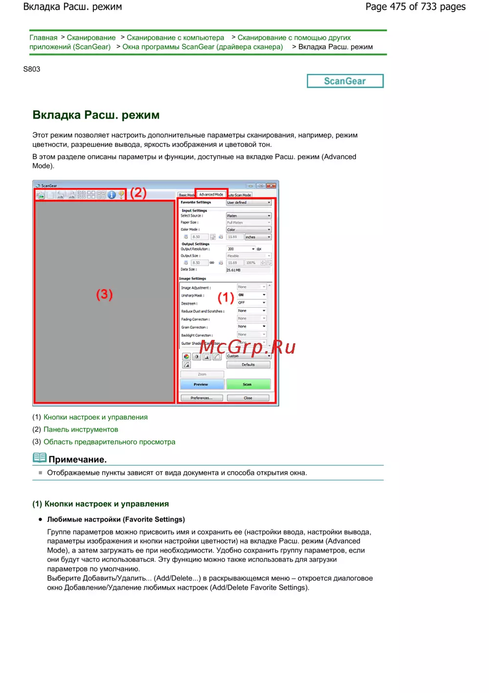 Окна программы ScanGear (драйвера сканера) > Вкладка Расш. режим