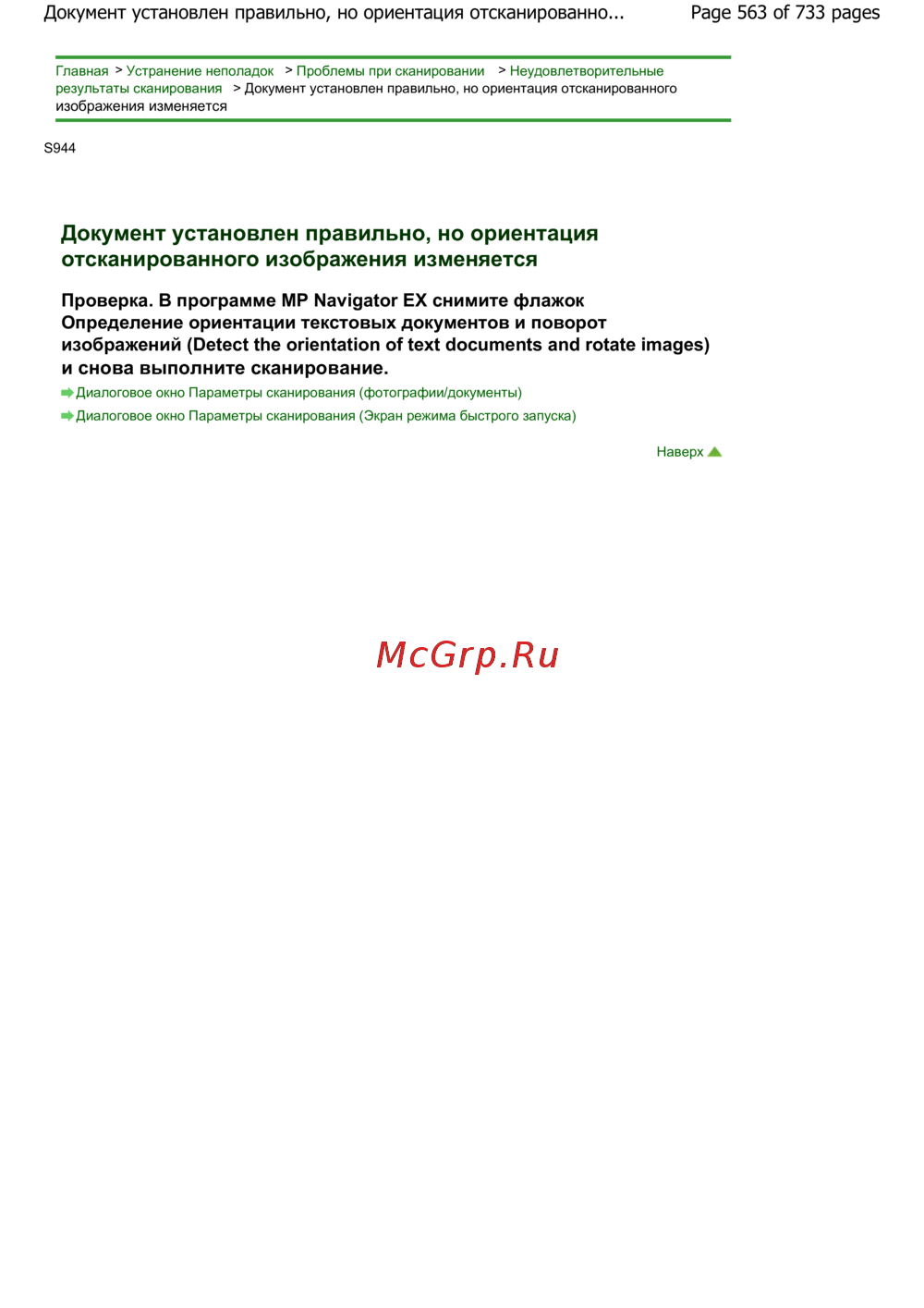 результаты сканирования > Документ установлен правильно, но ориентация отсканированного