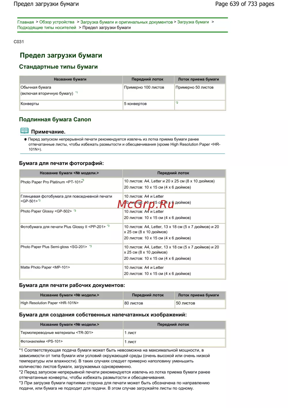 Узнайте о максимальных пределах загрузки бумаги для различных типов носителей. Подробная информация о совместимости и рекомендациях для печати.