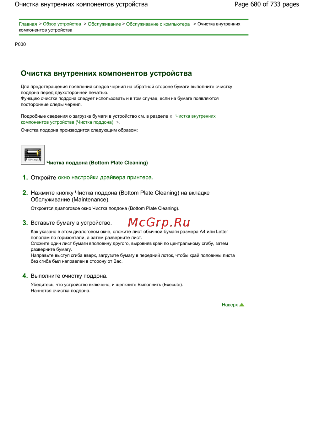 Нажмите кнопку Чистка поддона (Bottom Plate Cleaning) на вкладке