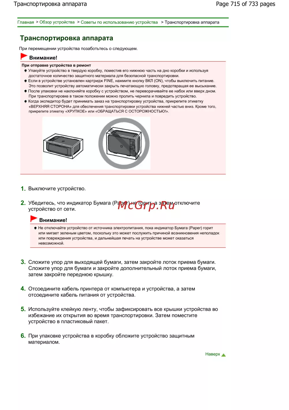 Canon Pixma MG2140 — советы по безопасной транспортировке устройства для печати [715/733]