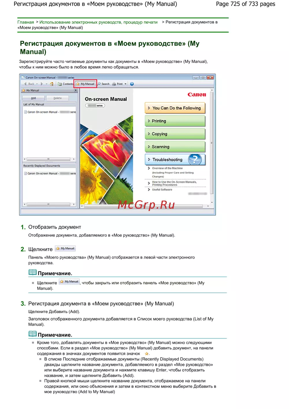 Кроме того, добавлять документы в «Мое руководство» (My Manual) можно следующими