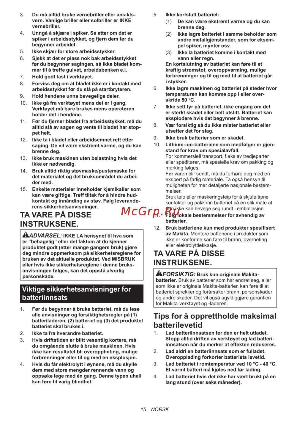 Makita DJR188Z без акк. и ЗУ [15/44] Viktige sikkerhetsanvisninger for batteriinnsats