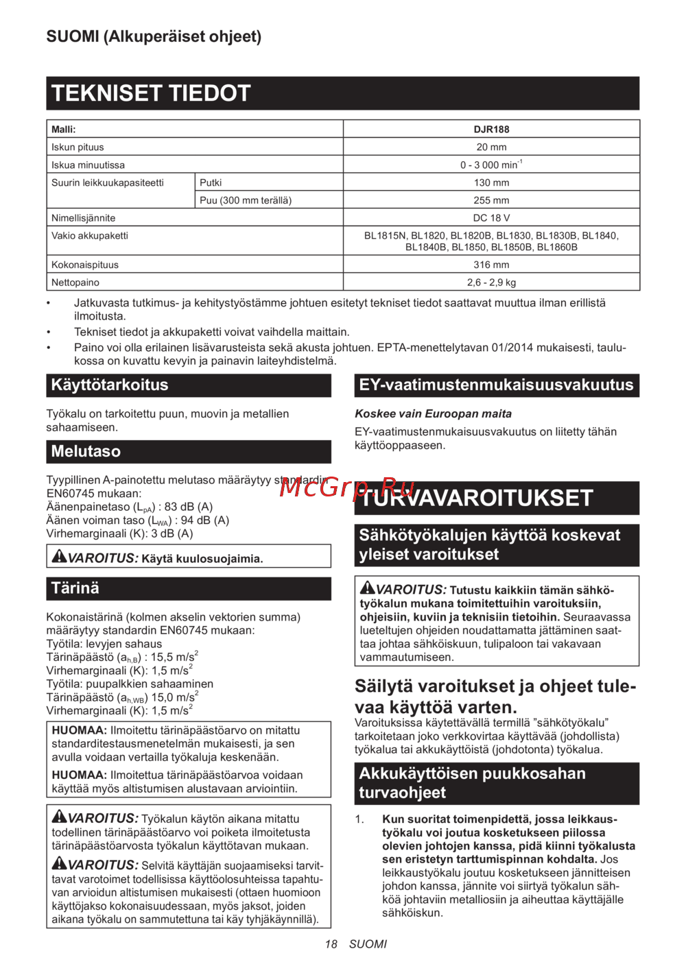 Makita DJR188Z без акк. и ЗУ [18/44] Suomi alkuperäiset ohjeet