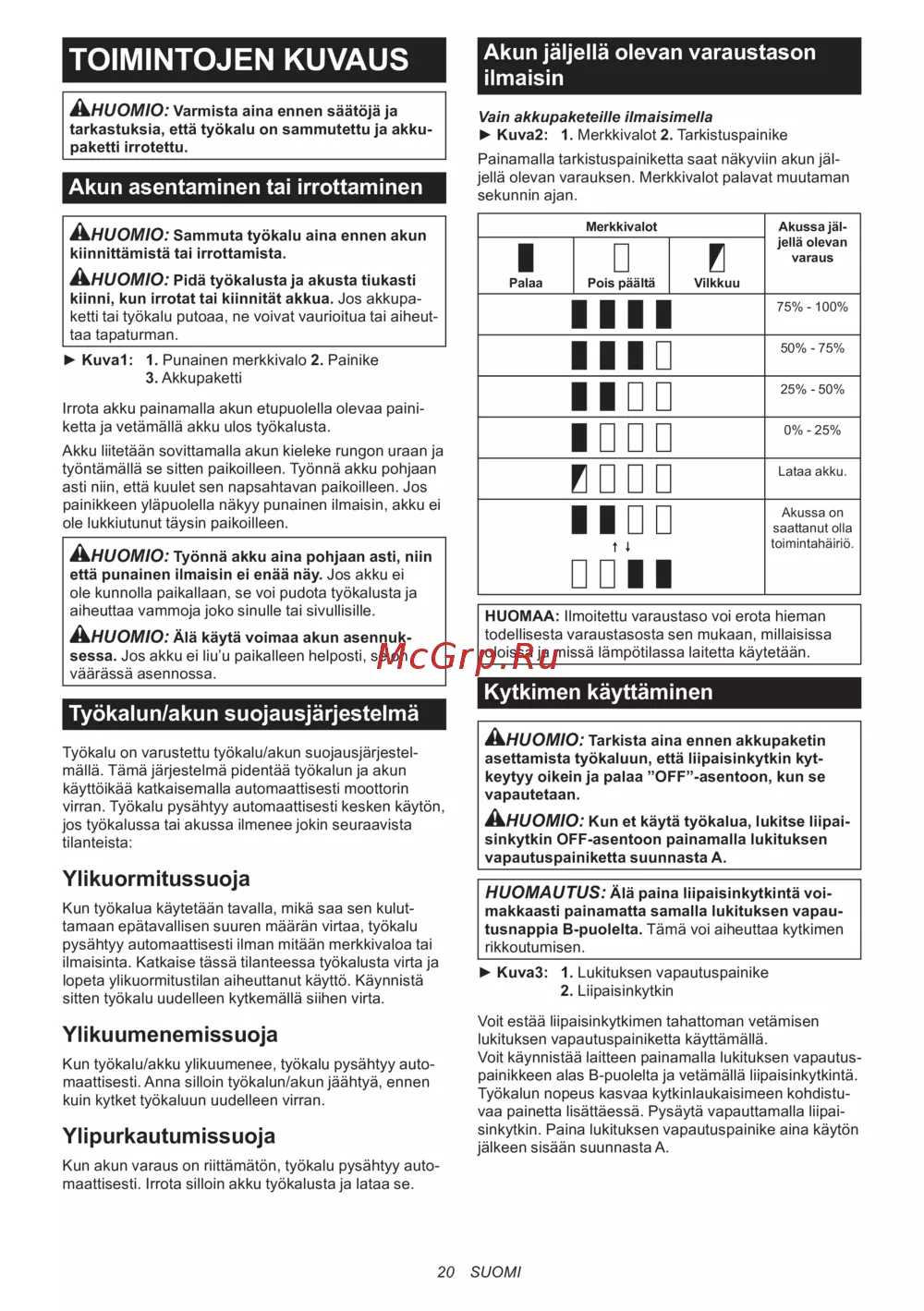 HUOMIO: Pidä työkalusta ja akusta tiukasti