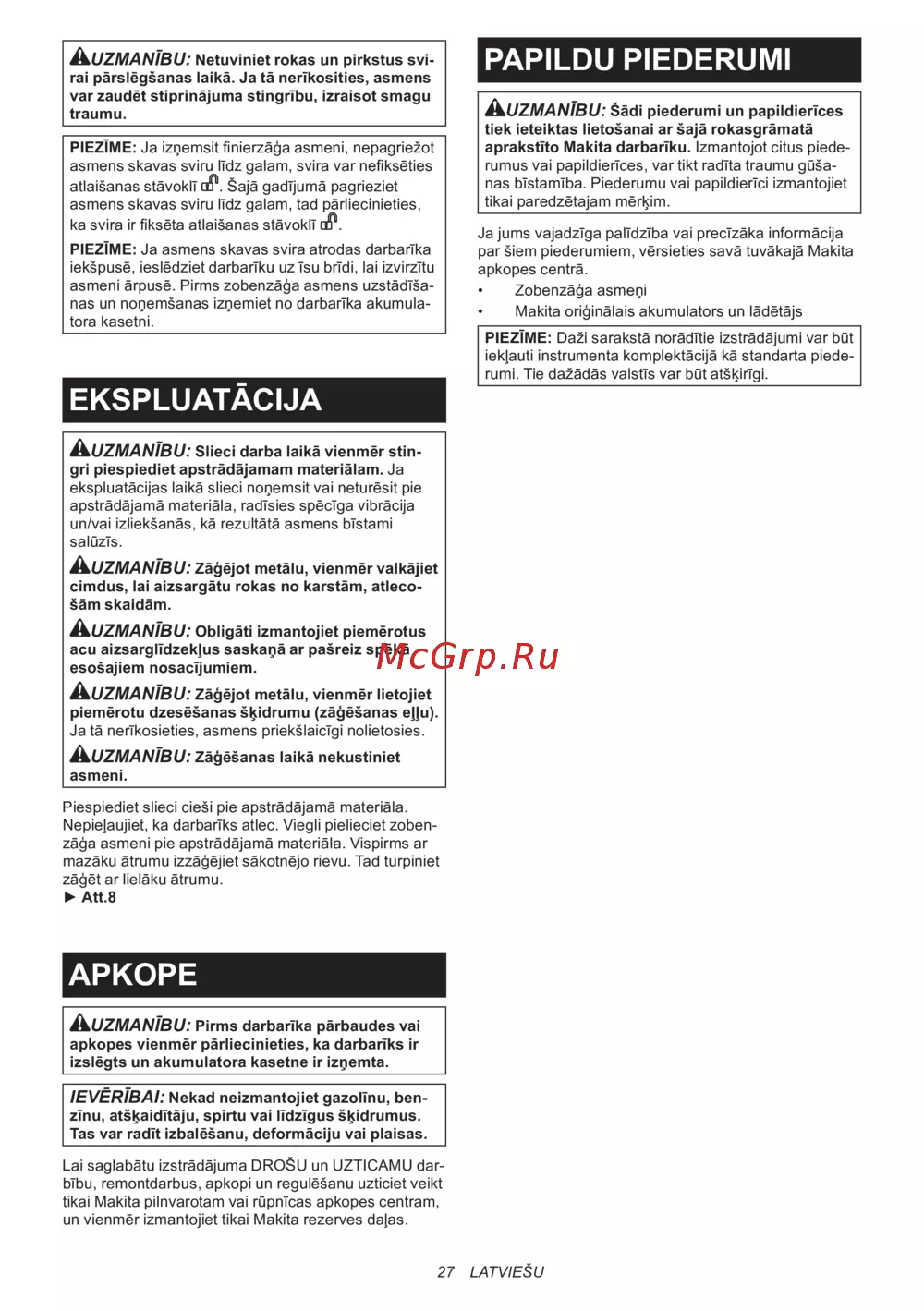 ![Makita DJR188Z без акк. и з.у [27/44] Uzmanību](/views2/1633570/page27/bg1b.png)