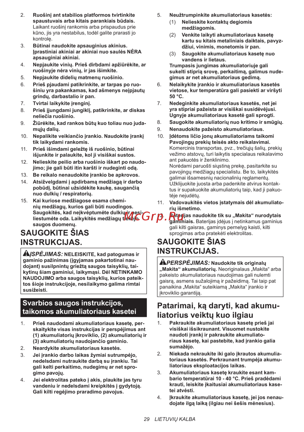 Makita DJR188Z без акк. и ЗУ [29/44] Svarbios saugos instrukcijos taikomos akumuliatoriaus kasetei
