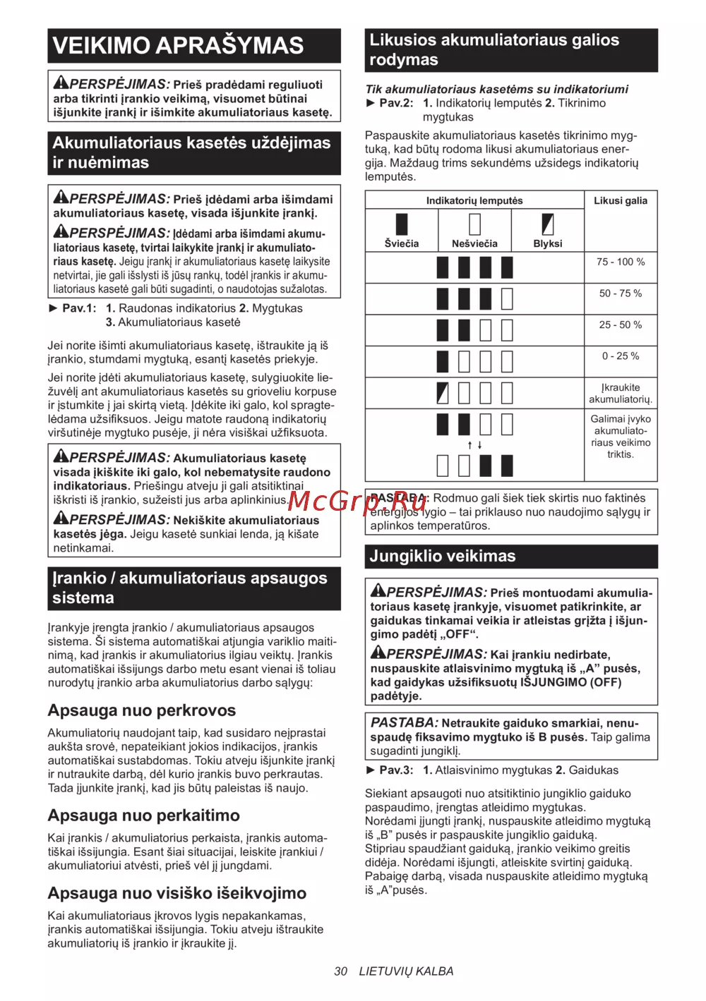 - Įrankio akumuliatoriaus apsaugos sistema p.30