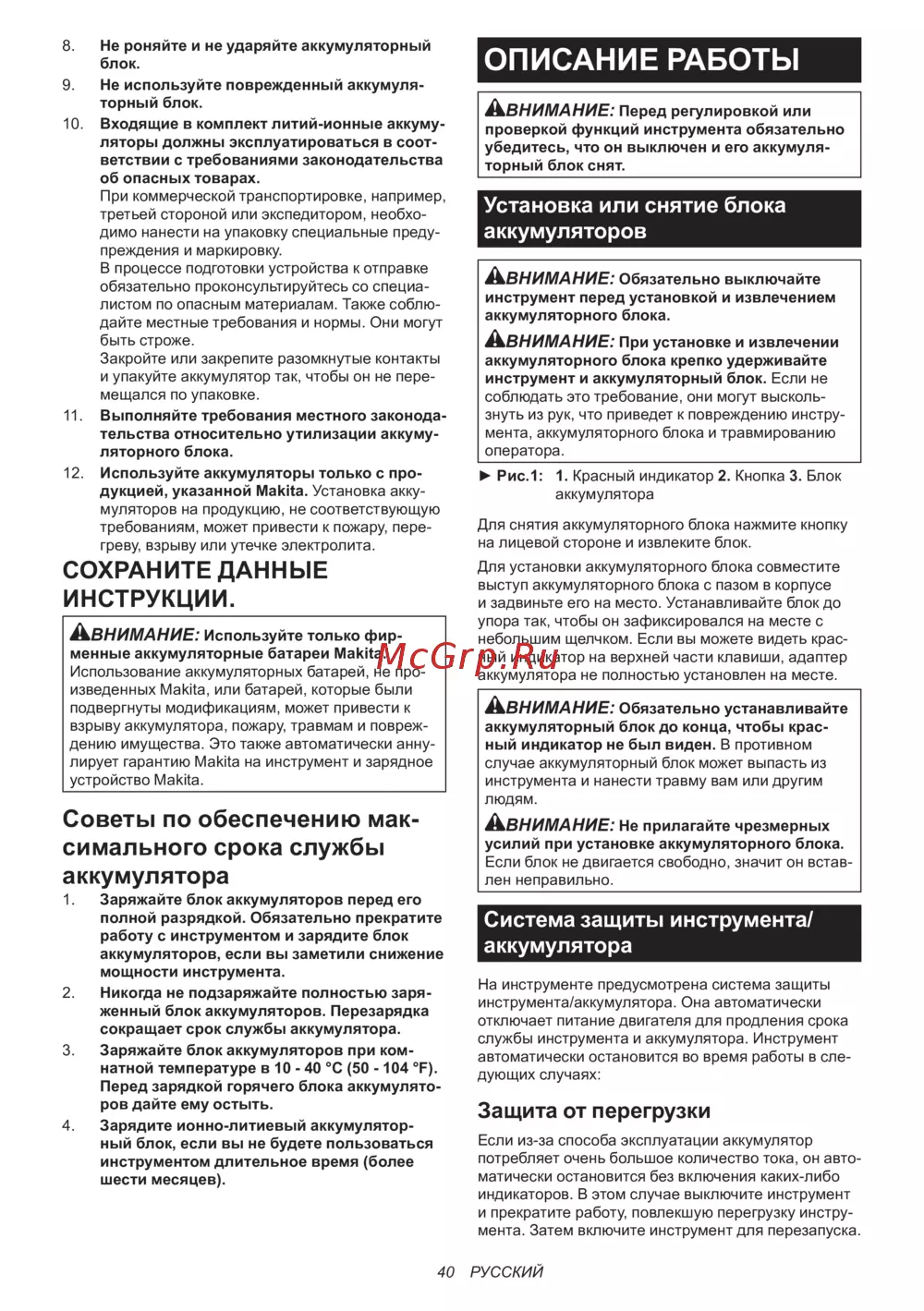 - Важные правила техники безопасности для работы с аккумуляторным блоком p.39