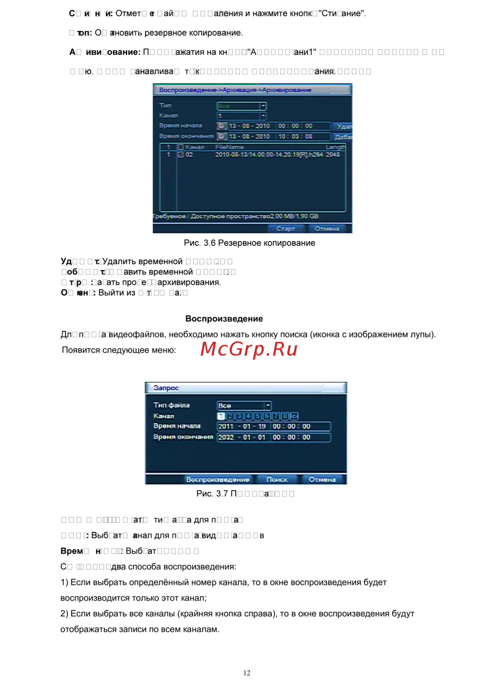 Стирание Отметьте файлы для удаления и нажмите кнопку Стирание Стоп Остановить резервное копирование Архивирование После нажатия на кнопку Архивирование появится следующее меню В нём устанавливаются критерии резервного копирования Рис 3 6 Резервное копирование Удалить Удалить временной отрезок Добавить Добавить временной отрезок Старт Начать процесс архивирования Отмена Выйти из этого окна Воспроизведение Для поиска видеофайлов необходимо нажать кнопку поиска иконка с изображением лупы Появится следующее меню Рис 3 7 Поиск файлов Тип файла Выбрать тип файла для поиска Канал Выбрать канал для поиска видеофайлов Время начала Выбрать время Существует два способа воспроизведения 1 Если выбрать определённый номер канала то в окне воспроизведения будет воспроизводится только этот канал 2 Если выбрать все каналы крайняя кнопка справа то в окне воспроизведения будут отображаться записи по всем каналам 12