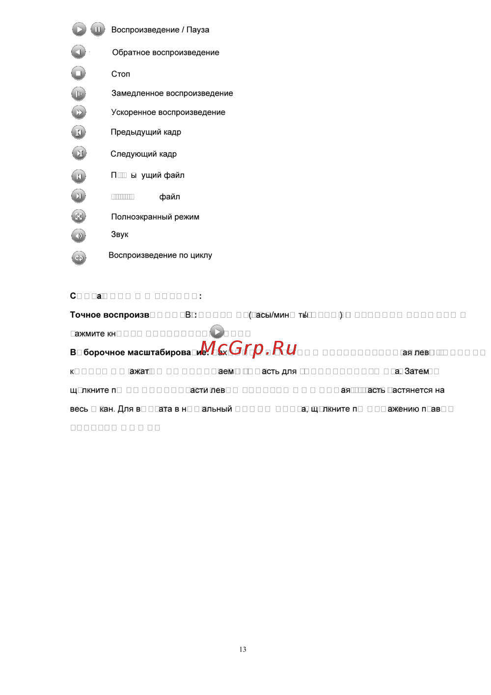 Воспроизведение Пауза Обратное воспроизведение Стоп Замедленное воспроизведение Ускоренное воспроизведение Предыдущий кадр Следующий кадр Предыдущий файл Следующий файл Полноэкранный режим Звук Воспроизведение по циклу Специальные функции Точное воспроизведение Введите время часы минуты секунды в столбце времени и нажмите кнопку воспроизведения 44 Выборочное масштабирование Находясь в режиме воспроизведения удерживая левую кнопку мыши нажатой выделите желаемую область для увеличенного просмотра Затем щёлкните по выделенной области левой кнопкой мыши Выделенная область растянется на весь экран Для возврата в нормальный режим просмотра щёлкните по изображению правой кнопкой мыши в