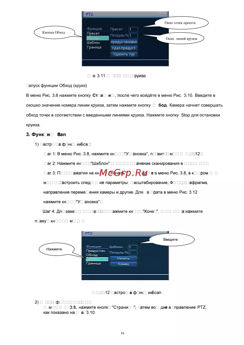 I PTZ Функция Пресет 1 Патруль Ы 1 Шаблон предустановки Г раница Удал предуст Удалить тур Рис 3 11 Обход точек круиза Запуск функции Обход круиз В меню Рис 3 8 нажмите кнопку Страницы после чего войдёте в меню Рис 3 10 Введите в окошко значение номера линии круиза затем нажмите кнопку Обход Камера начнет совершать обход точек в соответствии с введенными линиями круиза Нажмите кнопку Stop для остановки круиза 3 Функция Scan 1 Настройка функции Scan Шаг 1 В меню Рис 3 8 нажмите кнопку Установка появится меню Рис 3 12 Шаг 2 Нажмите кнопку Шаблон и введите значение сканирования в окошко Шаг 3 После нажатия на кнопку Начать Вы попадёте в меню Рис 3 8 в котором Вы можете настроить следующие параметры Масштабирование Фокус Диафрагма направление перемещения камеры и другие Для возврата в меню Рис 3 12 нажмите кнопку Установка Шаг 4 Для завершения настроек нажмите кнопку Конец Для выхода нажмите правую кнопку мыши Рис 3 12 Настройка функции Scan 2 Вызов функции Scan В меню Рис 3 8 нажмите кнопку Страницы затем войдите в управление PTZ как показано на Рис 3 10 16