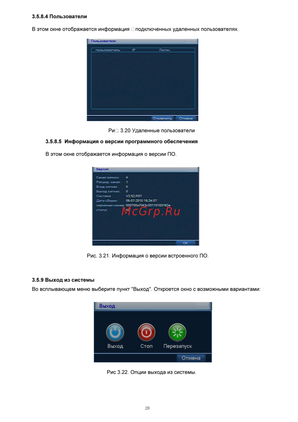 3 5 8 4 Пользователи В этом окне отображается информация о подключенных удаленных пользователях Рис 3 20 Удаленные пользователи 3 5 8 5 Информация о версии программного обеспечения В этом окне отображается информация о версии ПО Рис 3 21 Информация о версии встроенного ПО 3 5 9 Выход из системы Во всплывающем меню выберите пункт Выход Откроется окно с возможными вариантами Рис 3 22 Опции выхода из системы 20