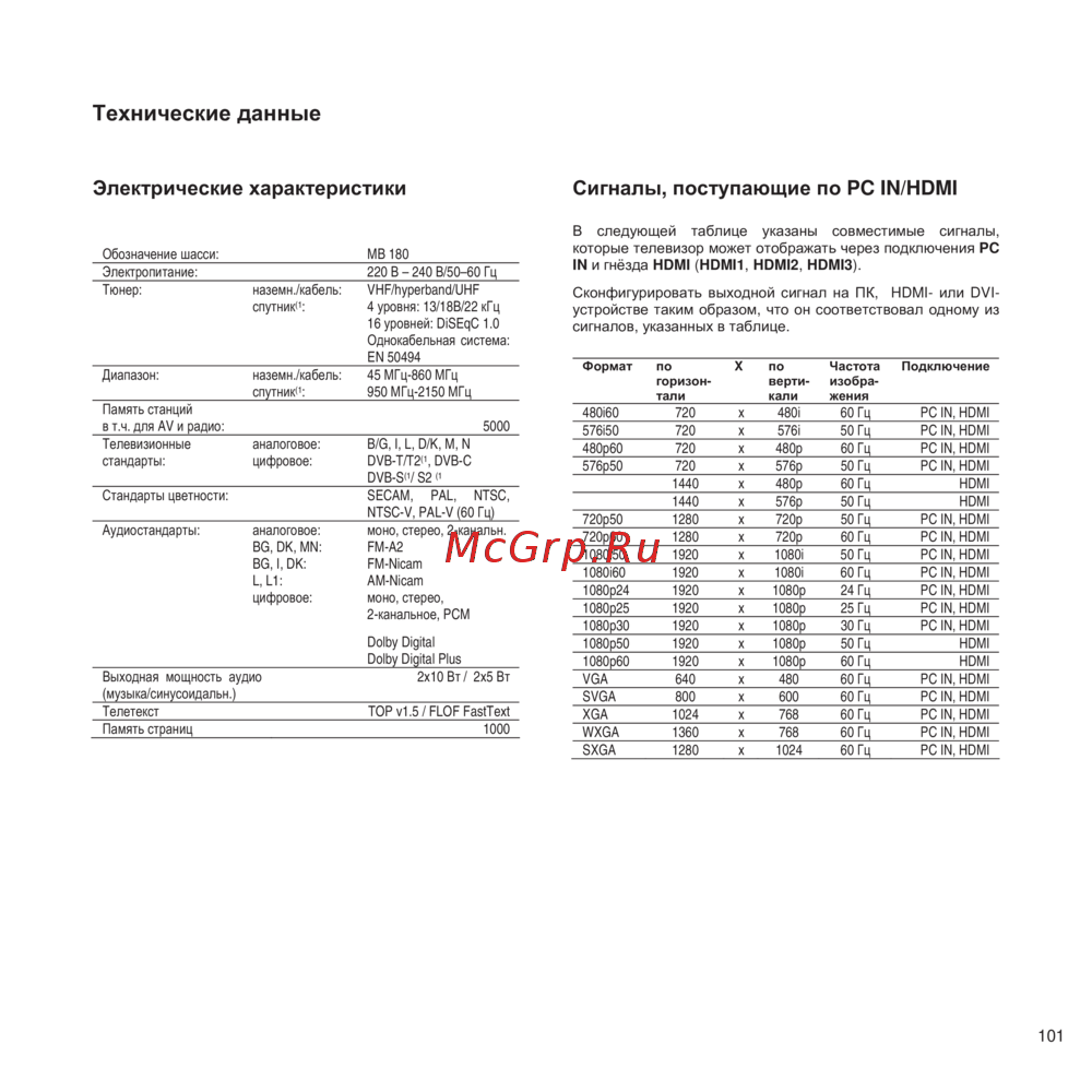 - Электрические характеристики сигналы поступающие по pc in hdmi p.101