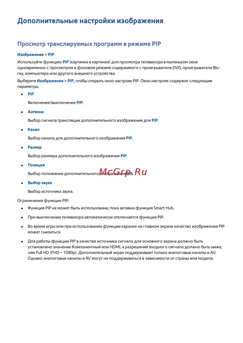 Функция PIP не может быть использована, пока активна функция Smart Hub.